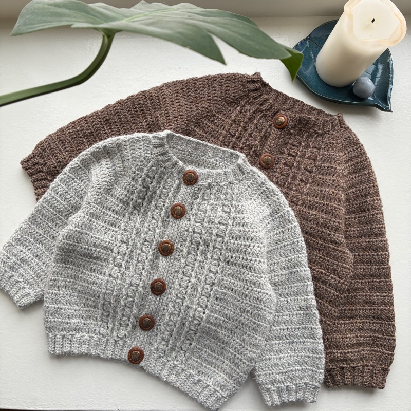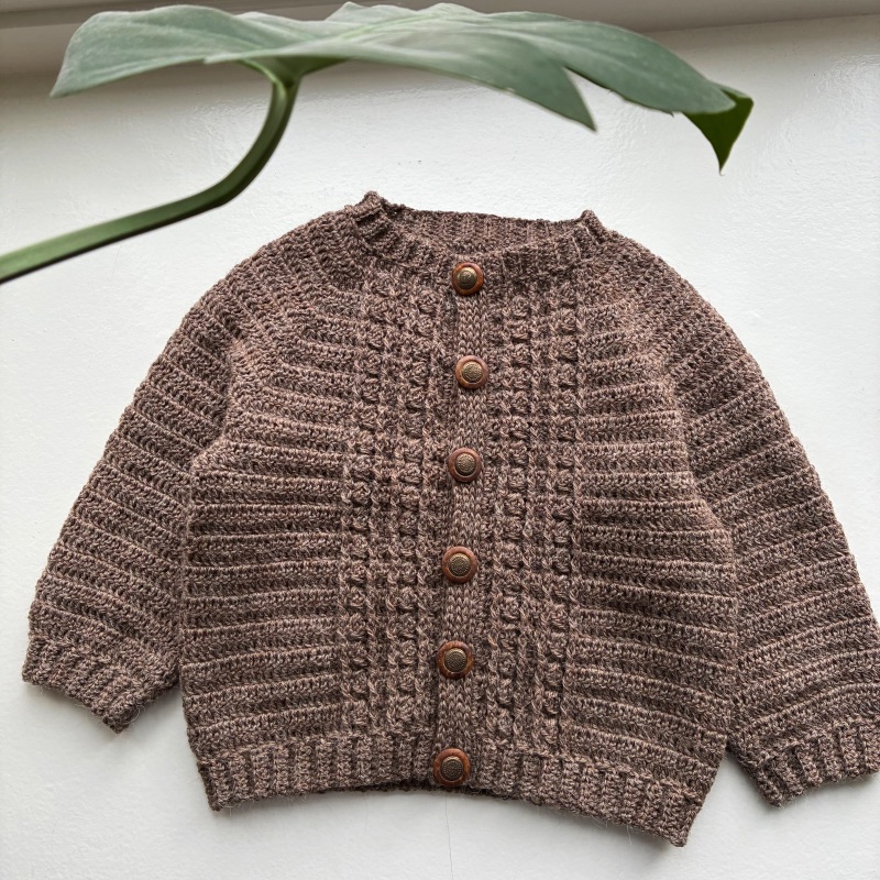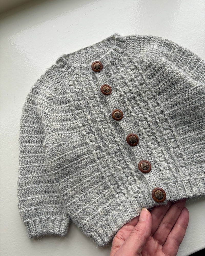 Trøjen hækles oppe fra og ned. Først hækles bærestykket, hvorefter arbejdet samles under armene og kroppen hækles ned. Ærmerne hækles direkte på rundt i ærmegabet og til sidst hækles ribkant i halsen samt stolper. Knapper syes fast med nål og tråd.