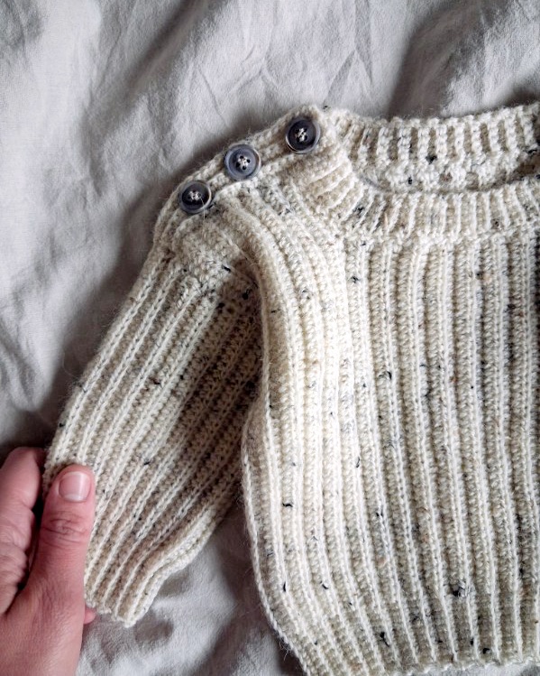 Sweateren hækles først i 2 separate dele, et forstykke og et bagstykke, som efterfølgende syes sammen langs den ene skuldersøm, hvorefter der hækles ribkant rundt i halsen. Langs den anden skuldersøm hækles stolpe og knaphulslukning. For- og bagstykke hækles sammen langs sidesømmene og derefter hækles ærmerne direkte på sweateren.