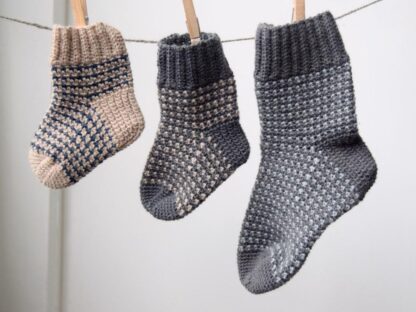 Nål forslag: 2,5 og 3 mm, eller de nåle der skal til for at ramme sokkernes hæklefasthed.